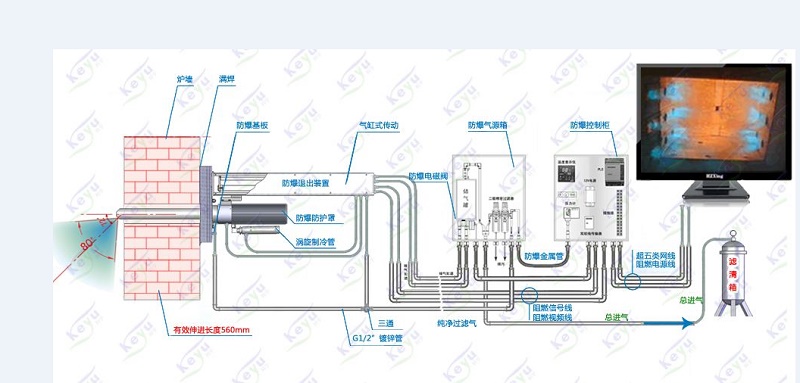 本設備采用強迫風(fēng)冷方式,使用簡(jiǎn)單,維護方便,不受環(huán)境限制;用1mm針孔鏡頭減少爐窯對設備的輻射熱;將冷卻氣從防護罩前端吹出,可以壓住窯爐內火焰,擋住灰塵。