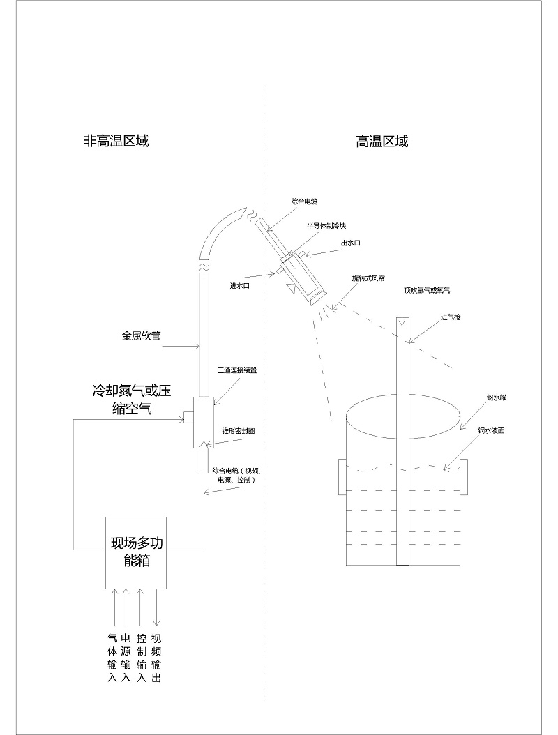 公司自主研發(fā)生產(chǎn)的轉爐爐口高溫針孔防濺除塵監控系統主要是在轉爐狗窩處的側面外層圍板處開(kāi)孔,將鏡頭伸入。采用微氣量保護方式, 集視頻技術(shù)、機電控制技術(shù)及傳感技術(shù)為一體的特種監控成像技術(shù),將煉鋼時(shí)轉爐內化學(xué)反應的狀況顯現在操作人員面前。